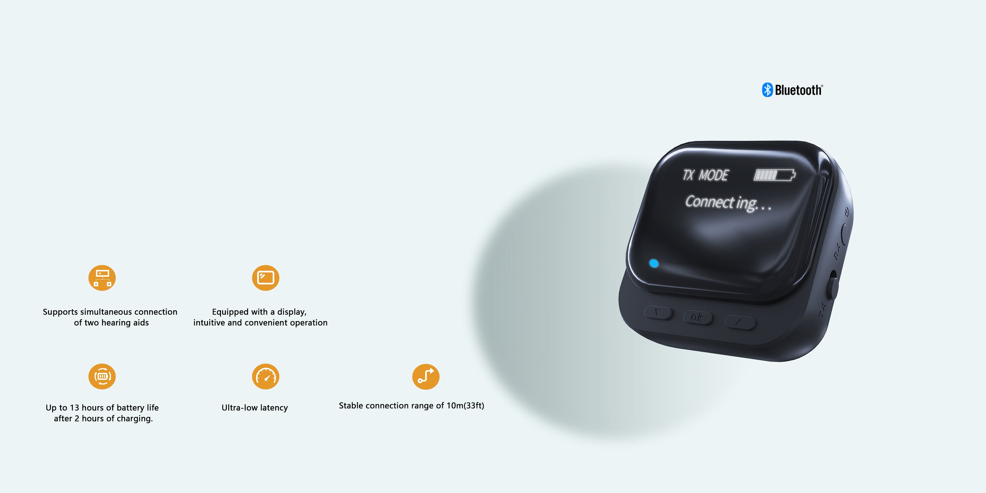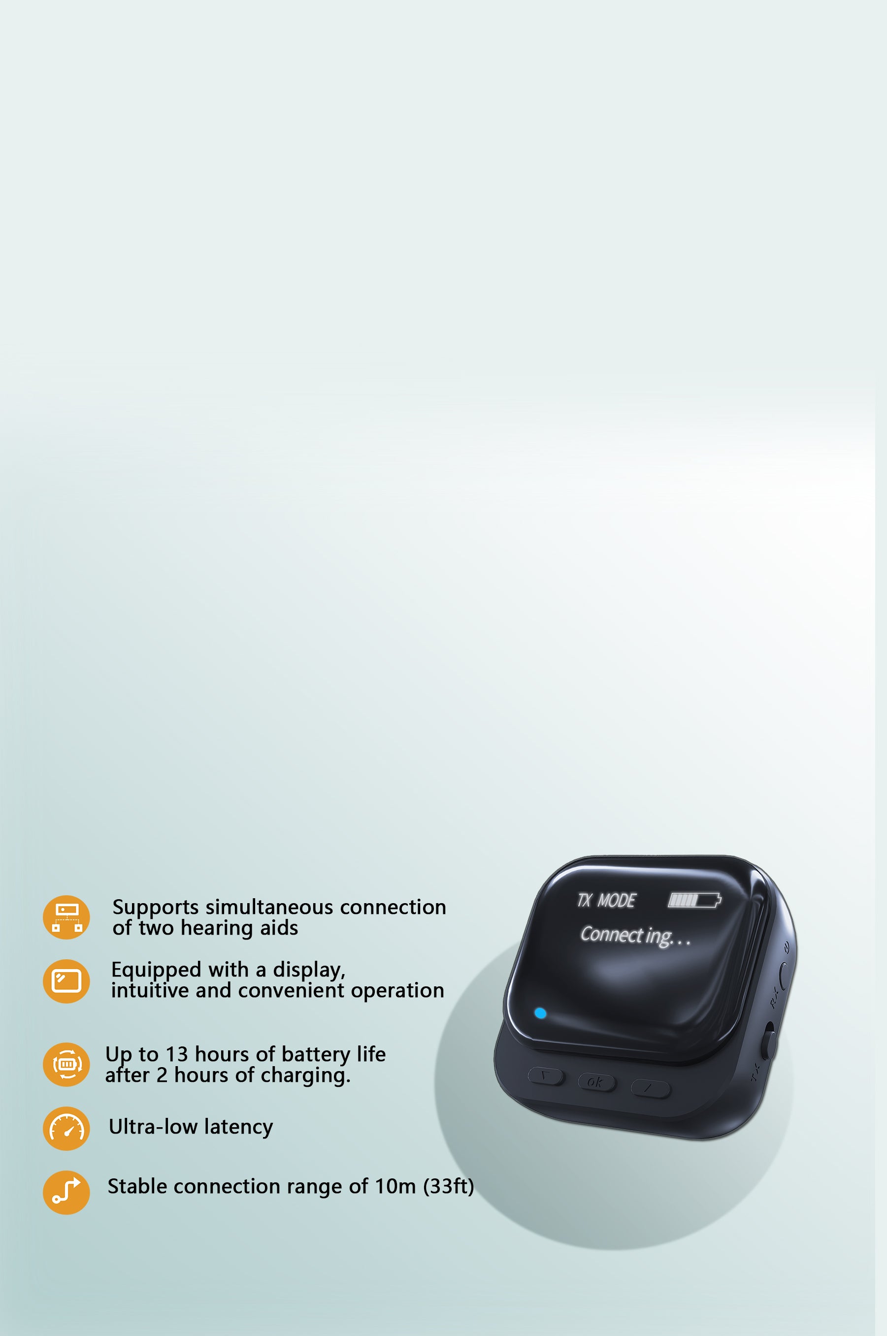 - Two-Hearing Aids Streaming- Connect two hearing aids simultaneously for listening