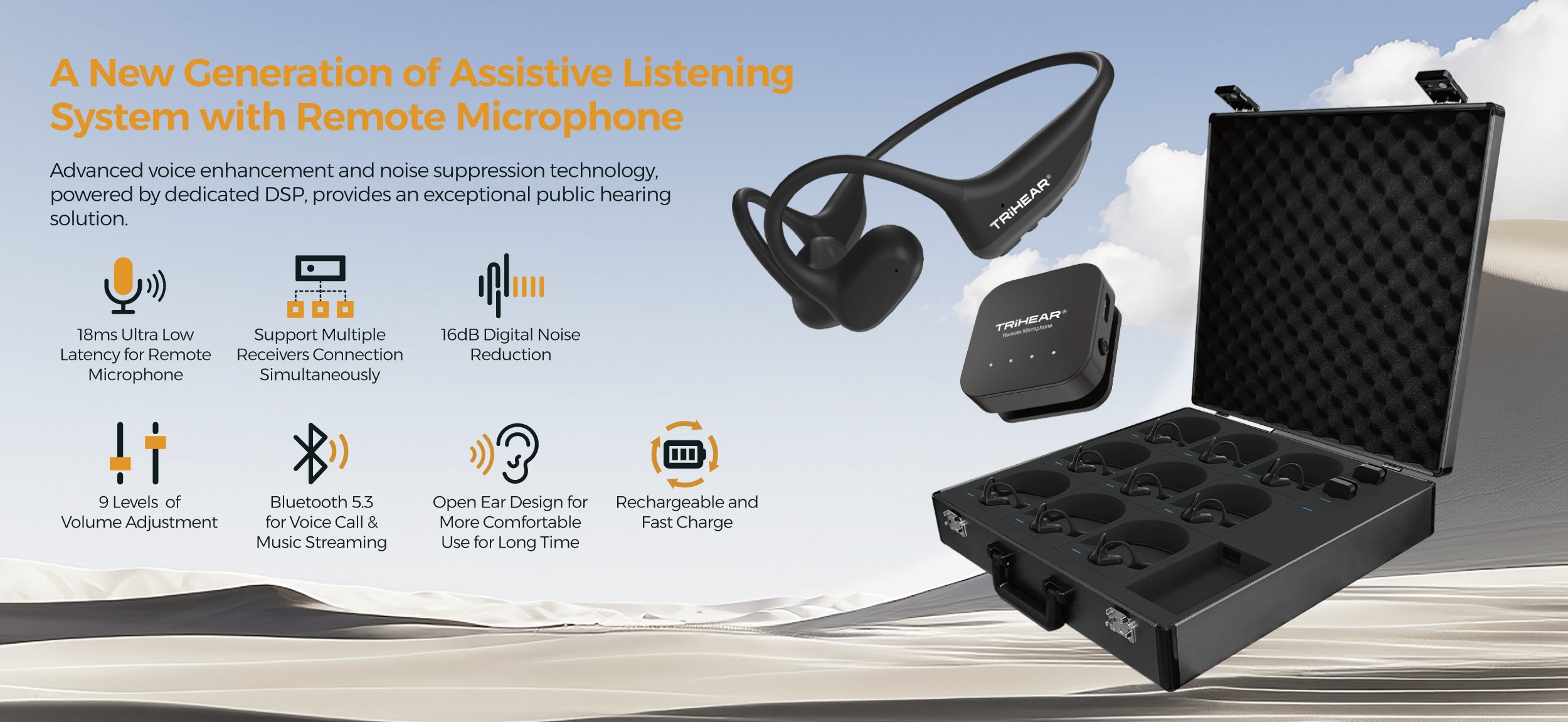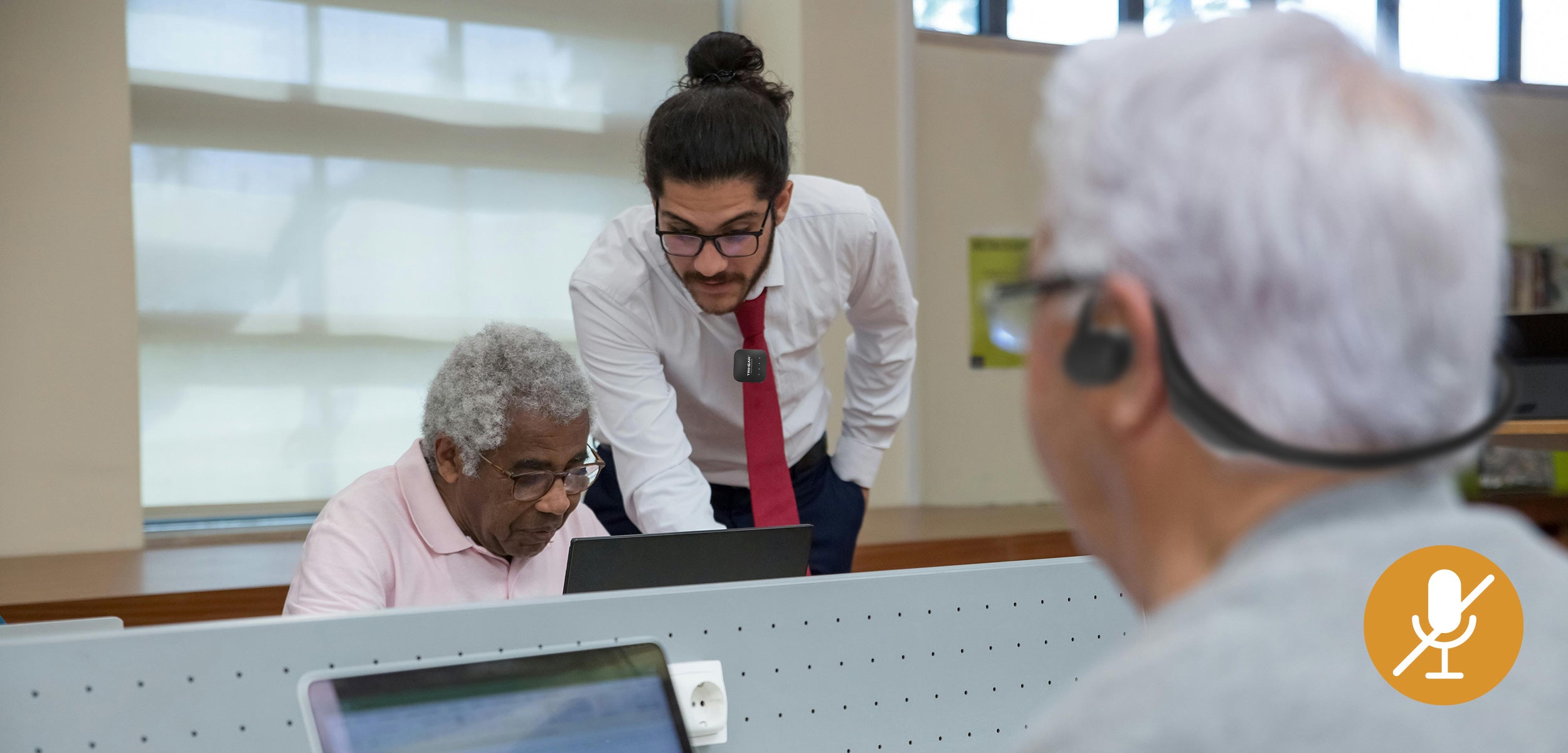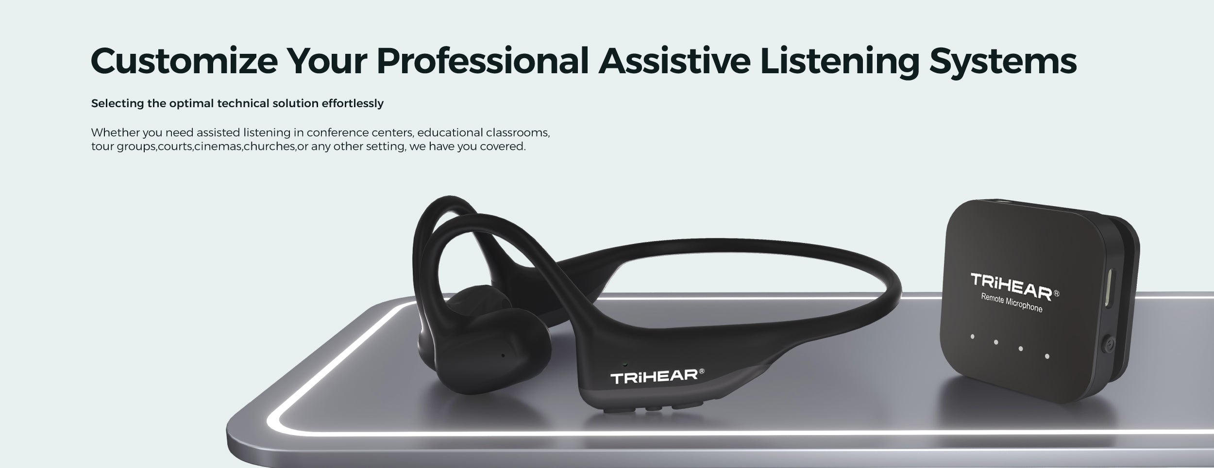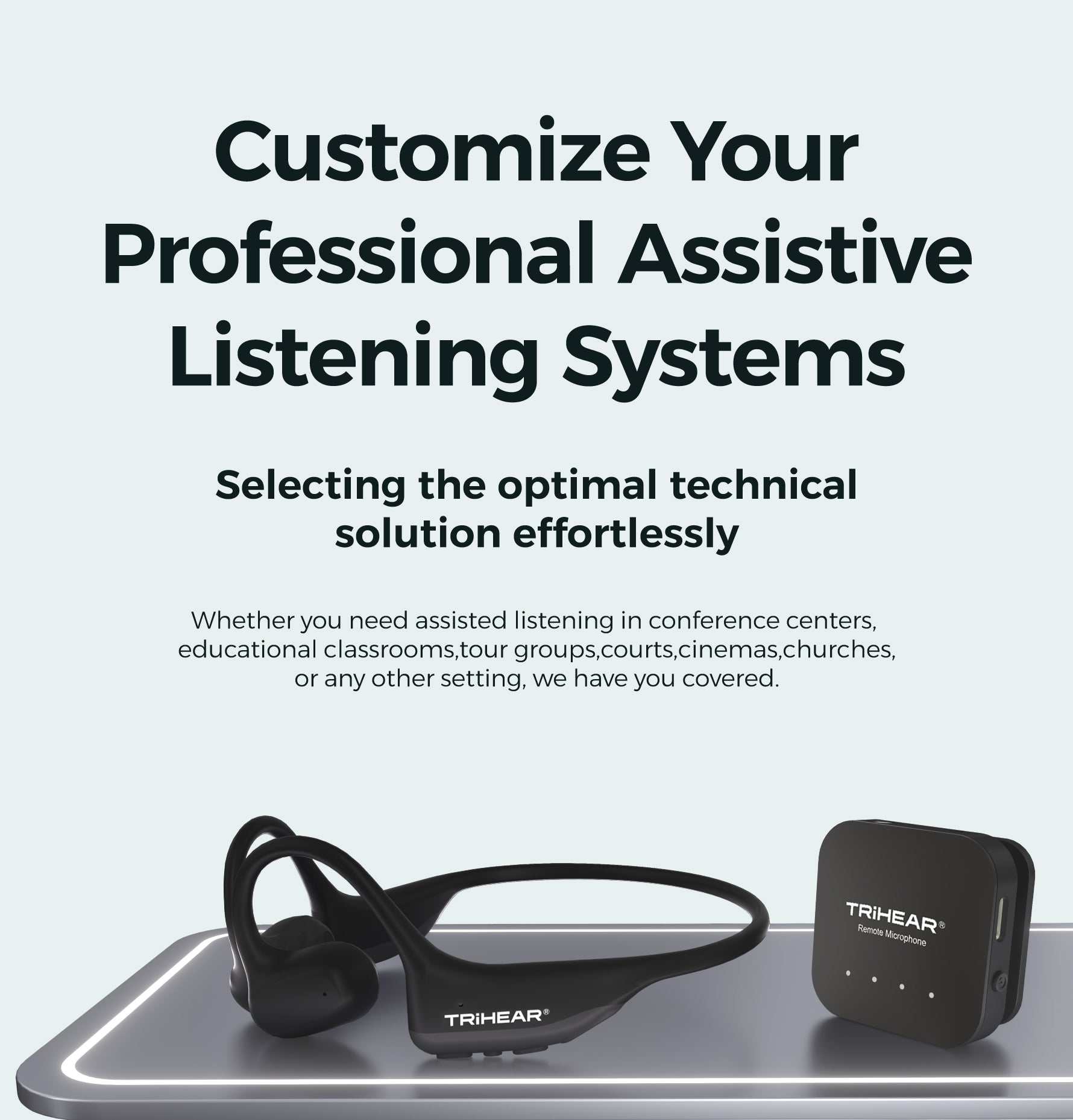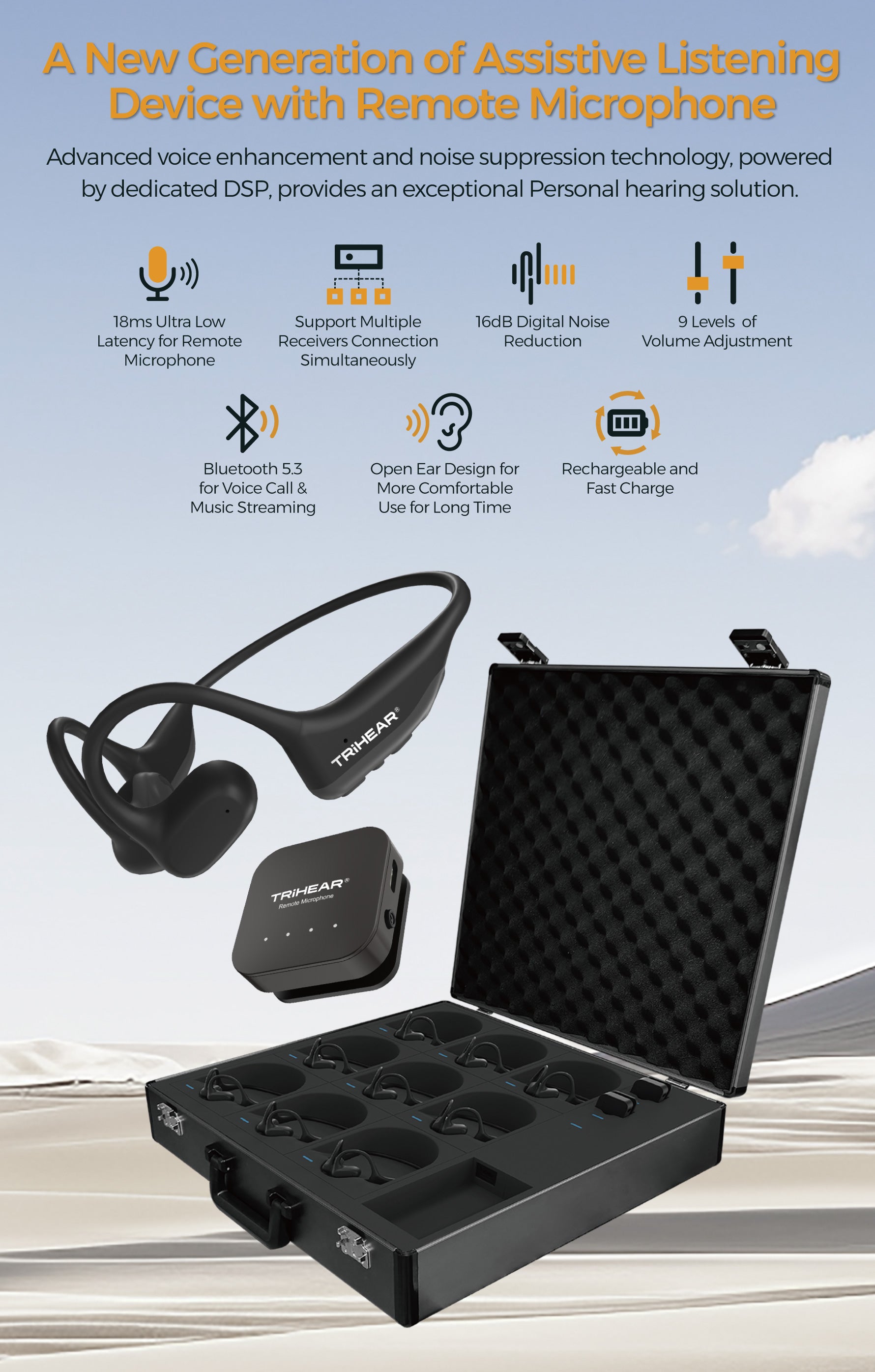 使用 Trihear 先进的遥控麦克风的静音按钮,提升您的聆听体验。只需按一下,即可轻松使麦克风静音,当您不想让别人听到您的声音时,可确保隐私。