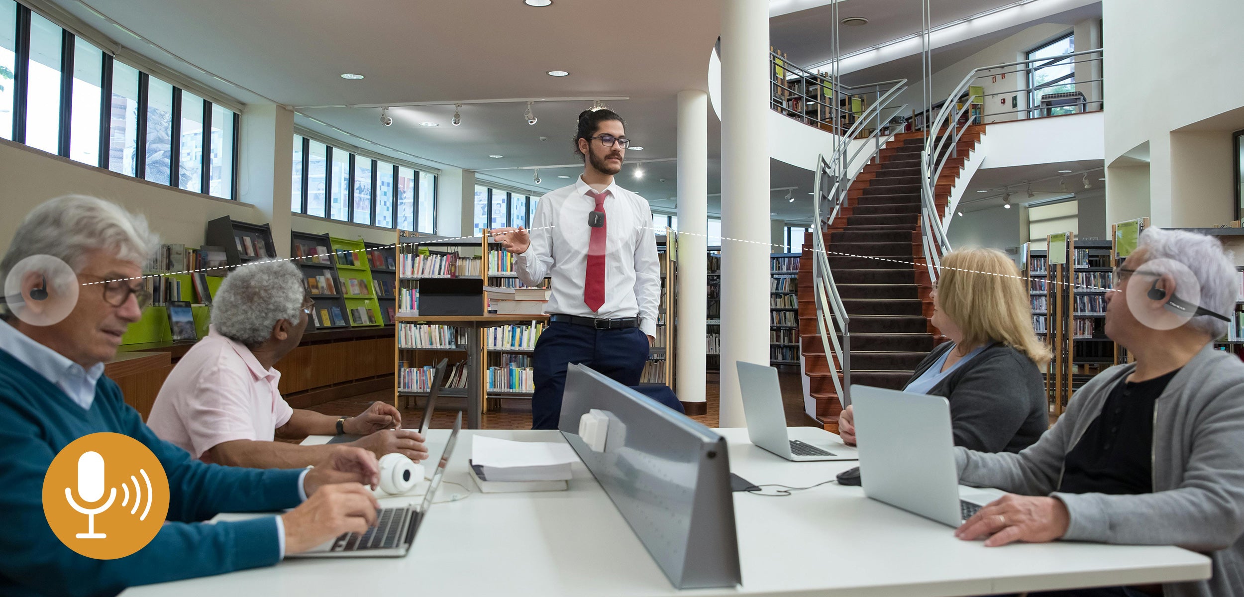 LiberMore 可实现一位领导者和多位参与者之间的无线单向通信。它允许多个接收器同时连接,确保在会议室、教室、教堂和老年旅游团等各种环境中都能获得清晰的音频。此功能促进了包容性沟通,可轻松调整以适应任何团体规模,从而获得引人入胜且不间断的聆听体验。